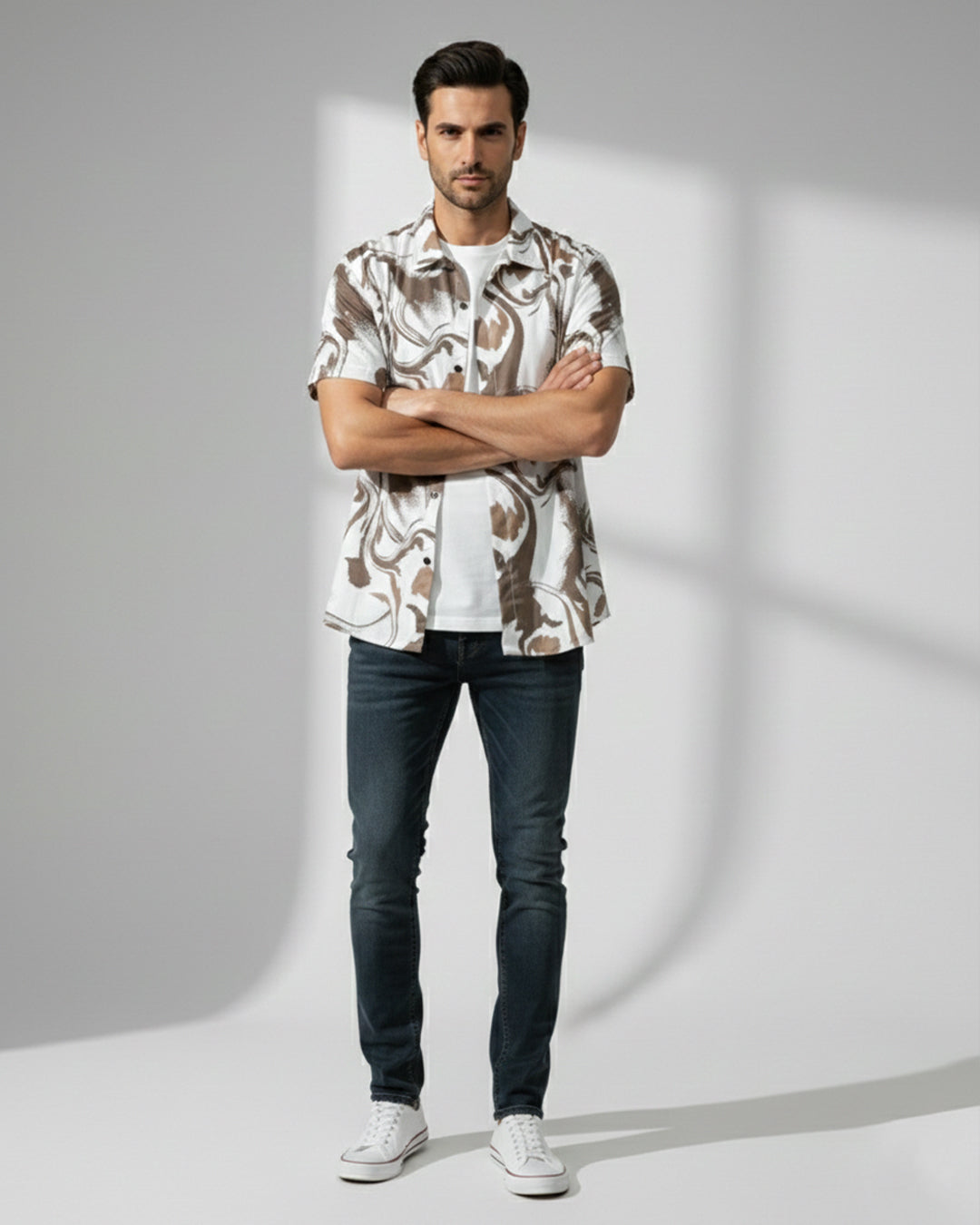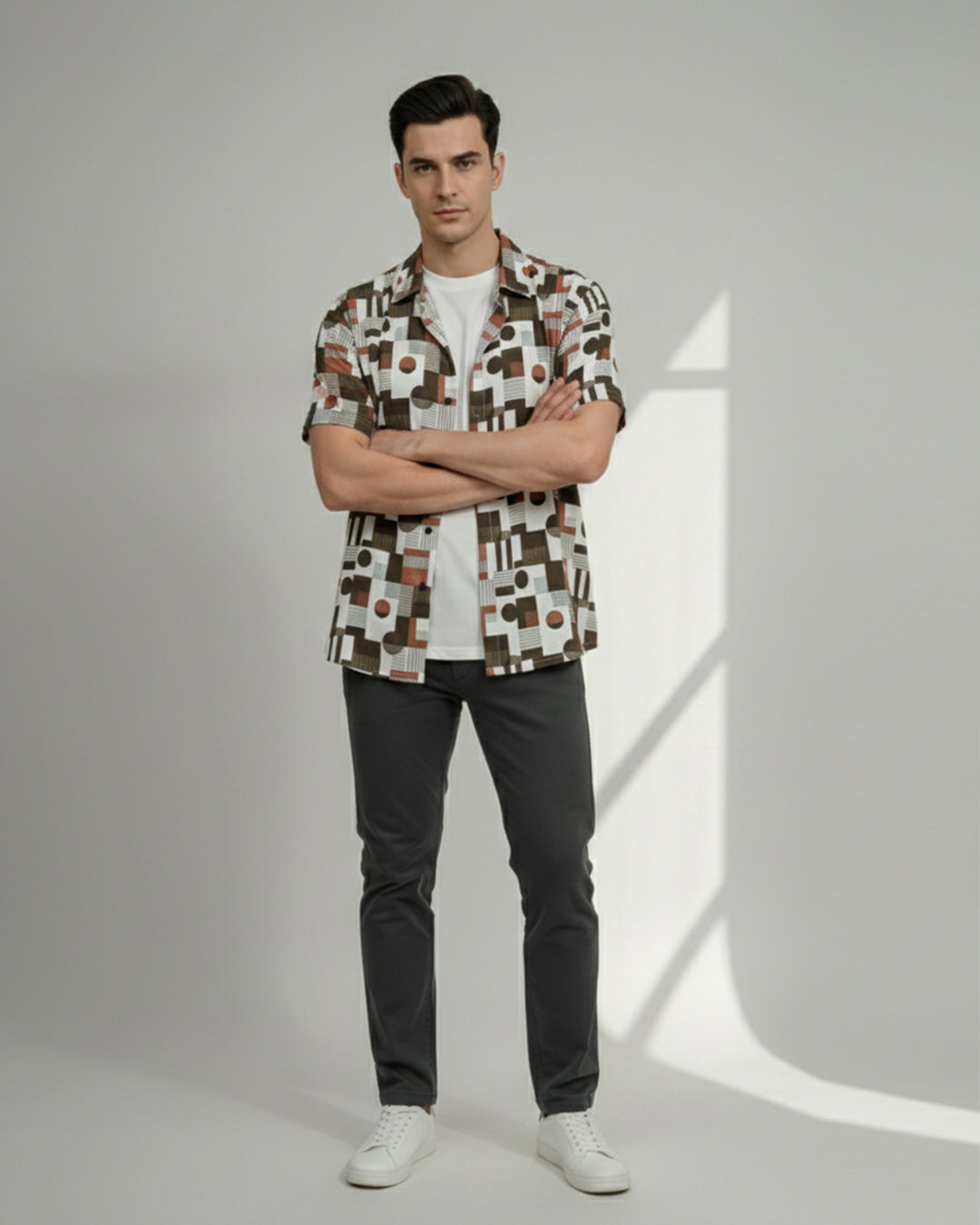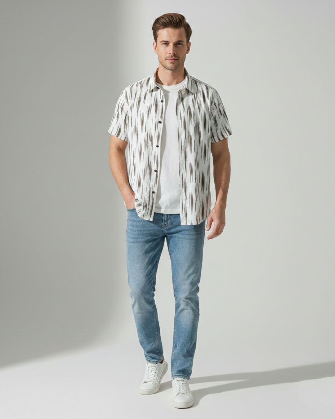 White ikat-print shirt