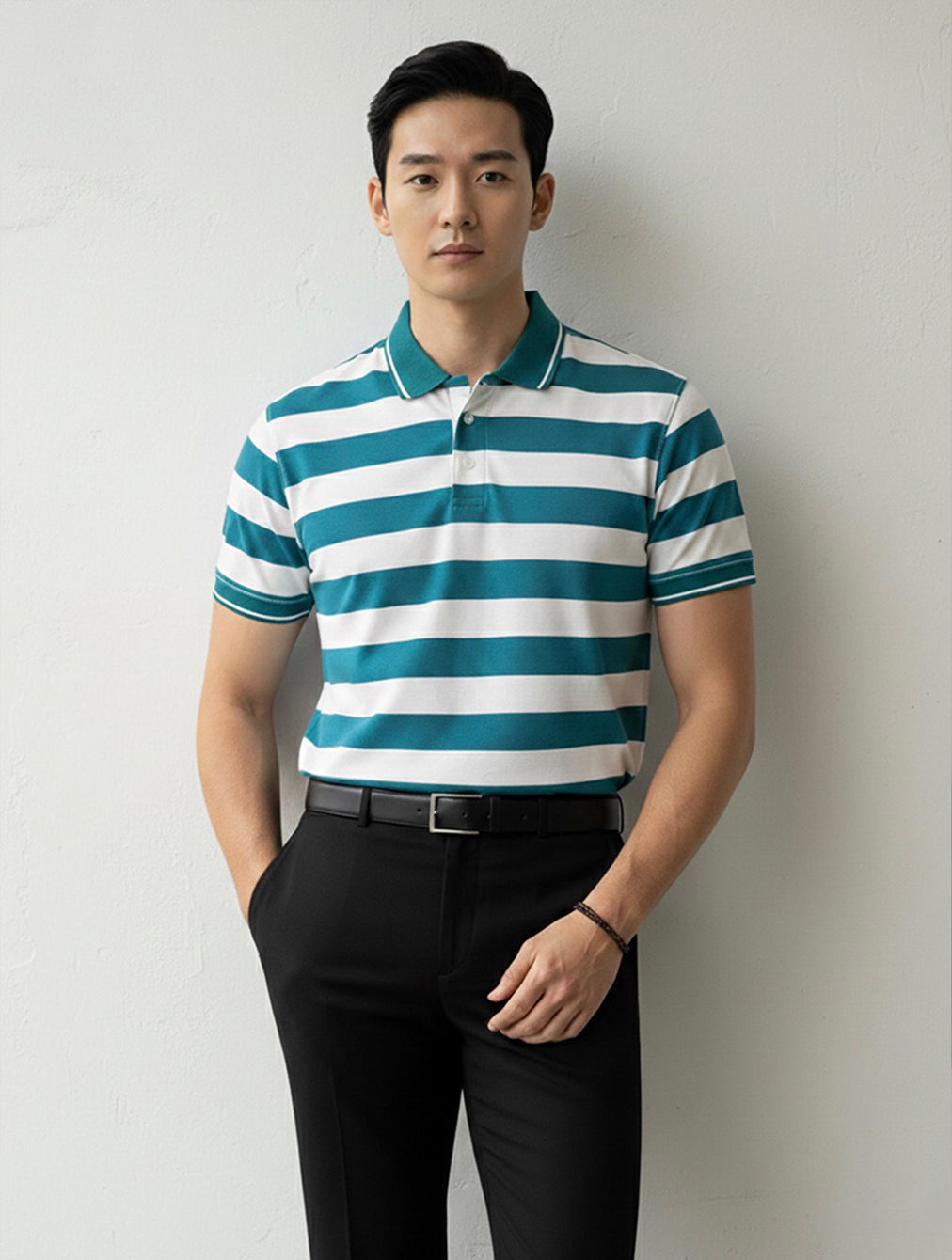 Redefine your smart-casual look with this timelessΒ horizontal striped polo. Β Featuring a classic three-button placket and...