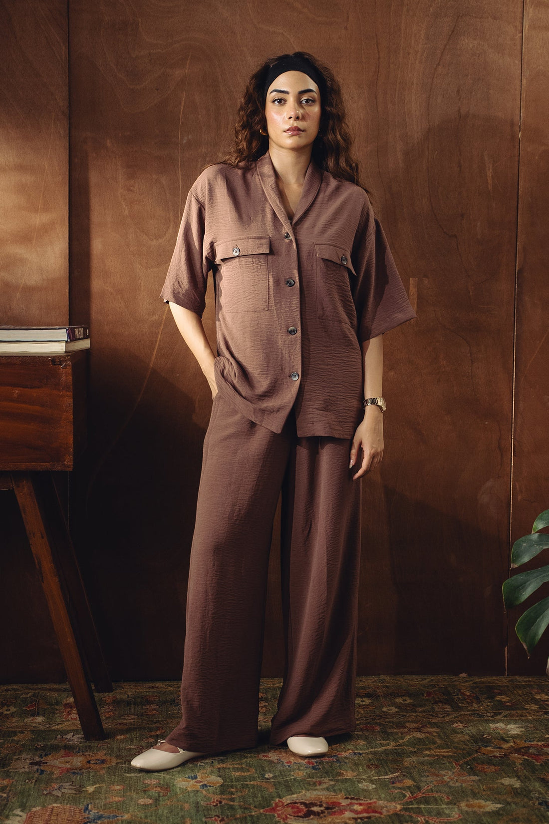 Satin Button-down Shirt - Chocolate Brown