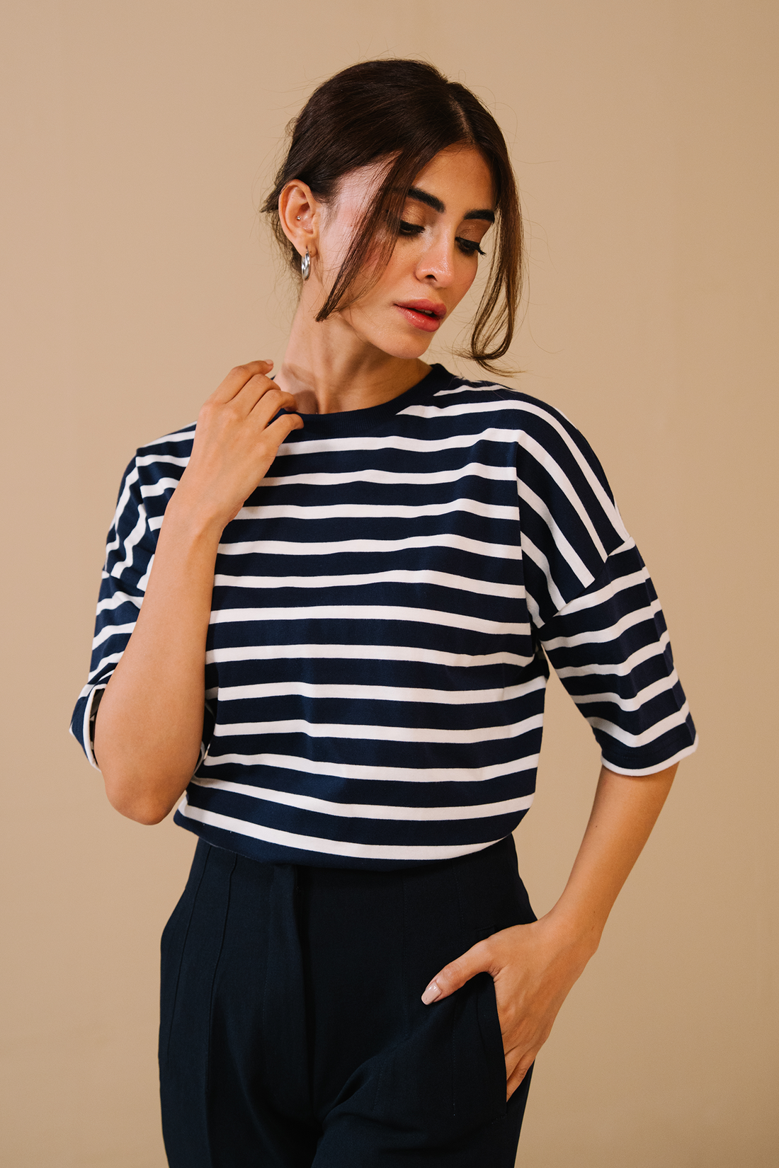 Relax Fit Stripe T-shirt featuring drop shoulders and neck rib. 100% CottonΒ Relax fit Model...