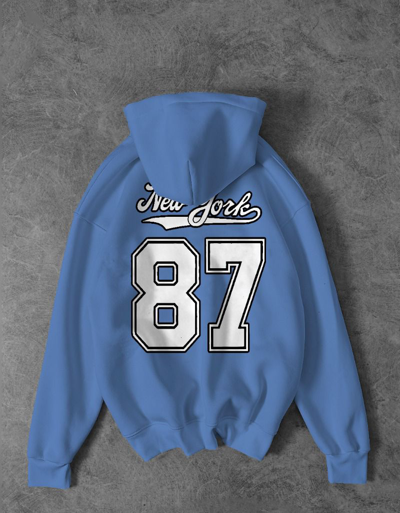 The Dreameaura Collegiate "New York 87" Pullover Hoodie offers a bold, oversized take on classic American sportswear. Crafted from a warm Fleece fabric, this hoodie features bold branding on both the front and back. The chest displays a script-style "New York" graphic, while the back features large, varsity-style numbers "87" outlined in a contrasting color. Its relaxed silhouette is perfect for comfort and layering.