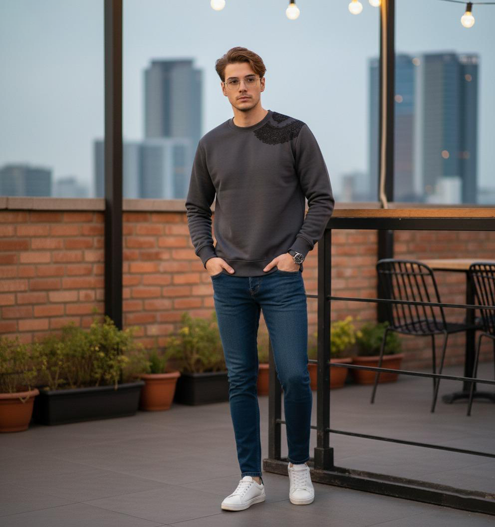 Elevate your essentials with the Dreameaura Embellished Shoulder Crewneck Sweatshirt. This premium pullover features a classic crewneck design crafted from soft, comfortable Cotton Fleece (based on Article Name: Front back Embossed Printed Sweatshirt). The clean silhouette is accented by intricate embossed or printed detailing covering one shoulder and extending to the back yoke, adding a subtle, high-end texture and graphic interest. Perfect for stylish layering over jeans for a smart-casual appearance.