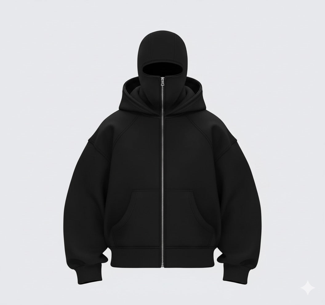 The signature feature is the integrated balaclava hood, allowing you to seamlessly transition from a standard hood to full face and neck coverage. Perfect for the street, cold weather, or simply elevating your comfort game.